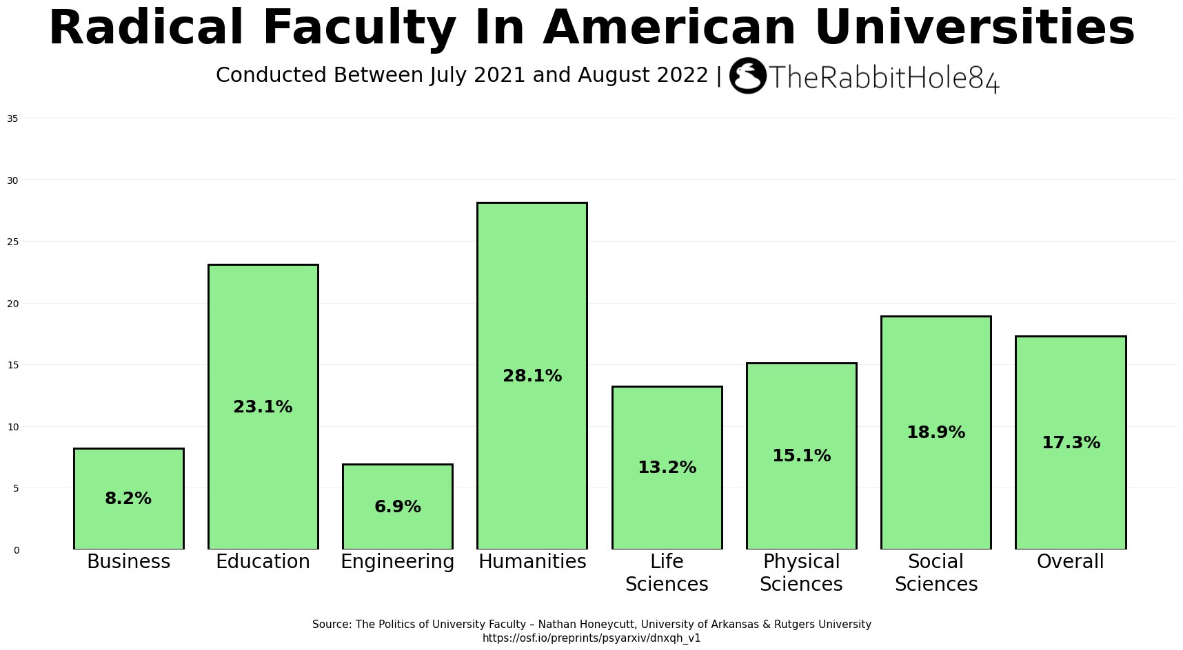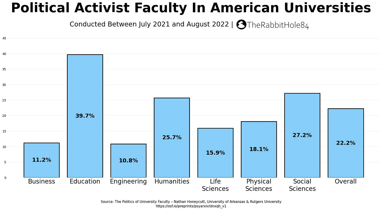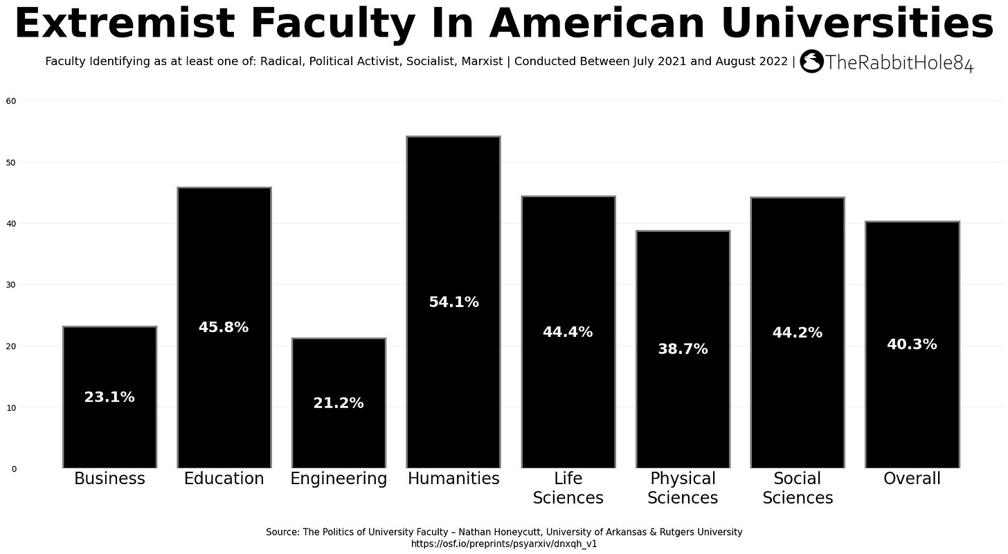 If you have ever wondered why so many educators seem politically motivated, then this might, at least in part, explain it. The Humanities (54.1%) are most affected, followed by Education (45.8%), Life Sciences (44.4%), and Social Sciences (44.2%). Business and Engineering are the least impacted. At a minimum, this data lends some credence to the argument that universities have become hotbeds of radical Left-wing ideology. It’s hard to argue otherwise when a majority of the Humanities faculty identify with some form of Left-wing extremism, and most other departments have between 21.2% and 45.8% of their faculty holding extremist viewpoints.