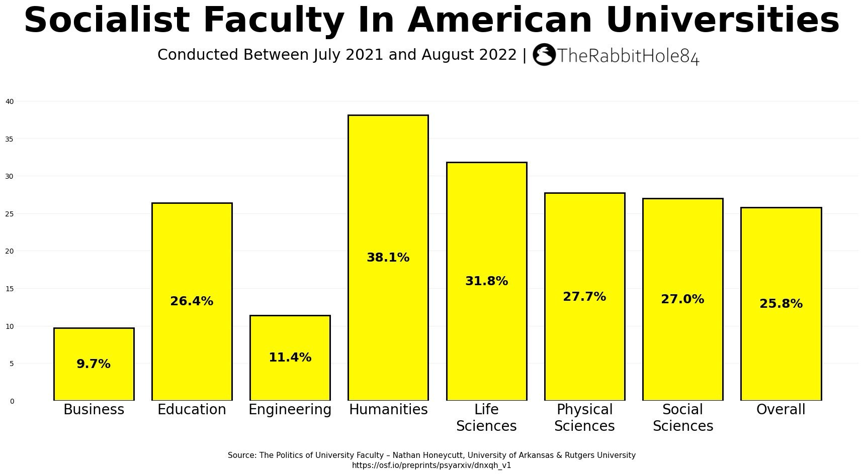 25.8% of American Univeristy faculty identify as Socialists. Humanities (38.1%) and Life Sciences (31.8%) have the highest share of Socialists, while Business (9.7%) and Engineering (11.4%) have the least.