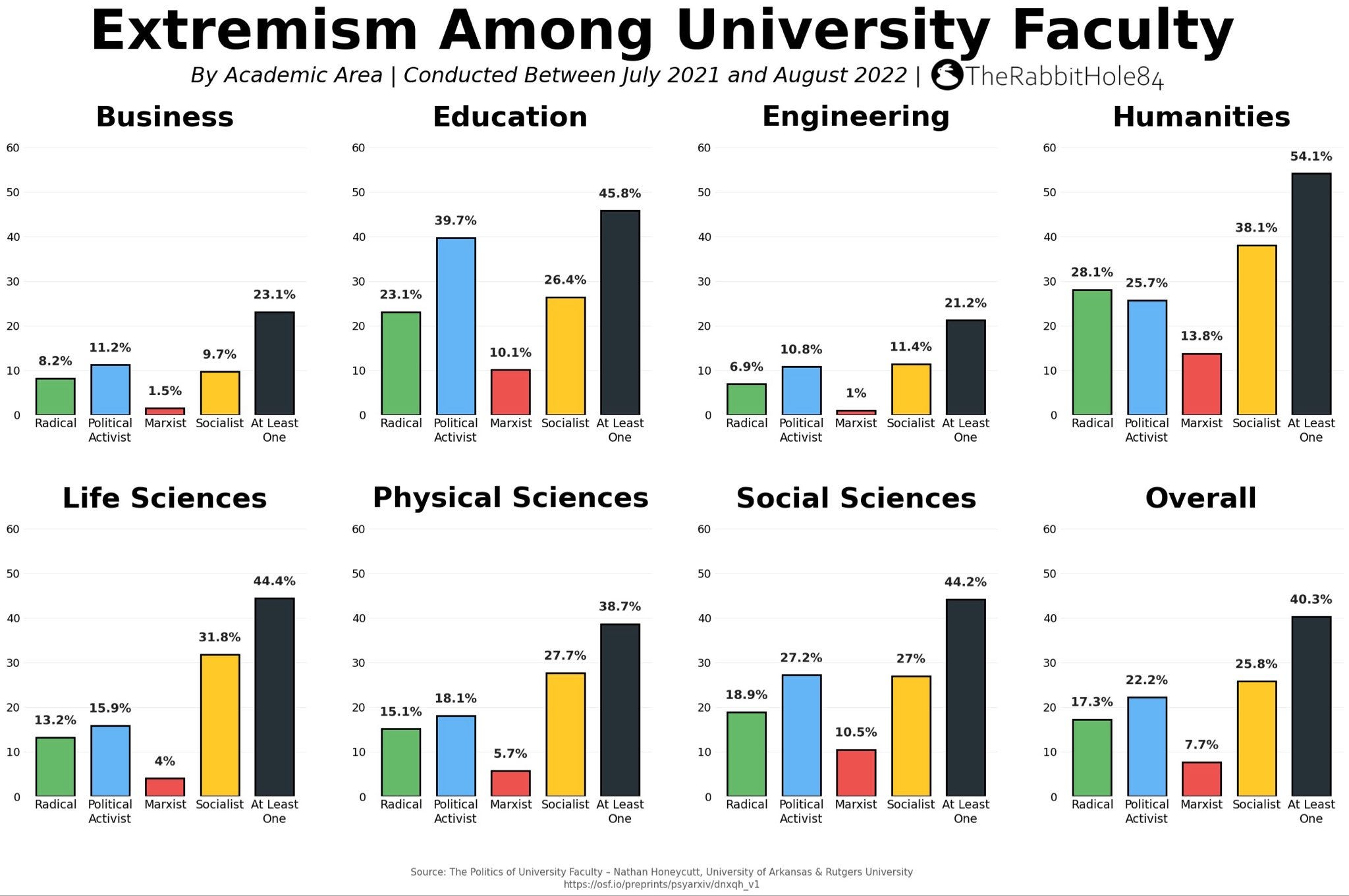 Education has the largest share (39.7%) of faculty who identify as Political Activists among academic areas. The Social Sciences have the next largest share (27.2%), with Business (11.2%) and Engineering (10.8%) being the least impacted.