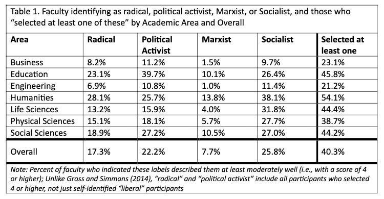 We can start things off by looking at this table from a study on the politics of American university faculty: